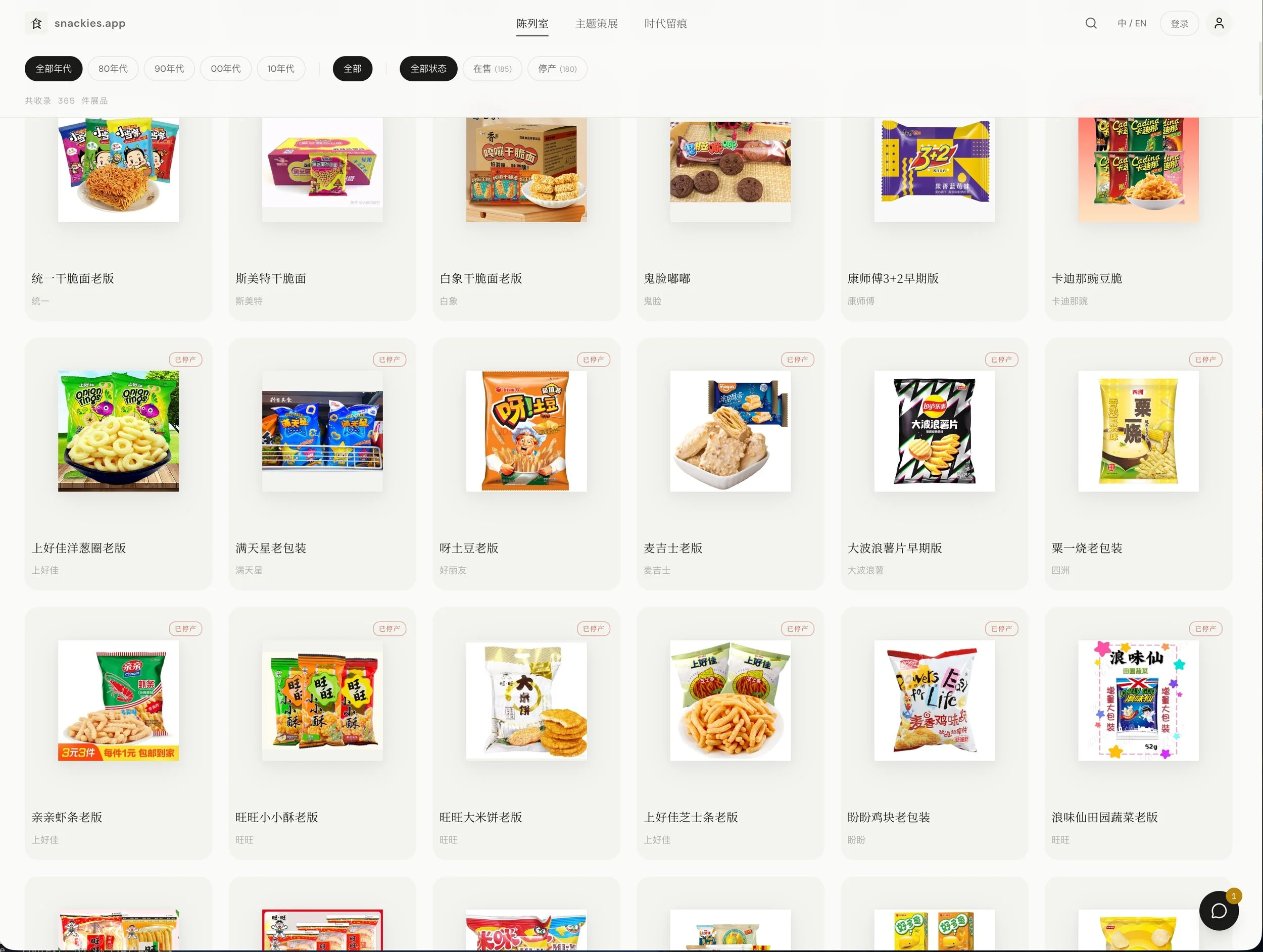 This is a self-initiated digital cultural preservation project. I built a structured archive of 300 Chinese packaged snacks across seven categories — including spicy strips, puffed snacks, candy, jerky, and nuts — with each entry documented by brand origin, production region, discontinuation status, and generational memory tags.